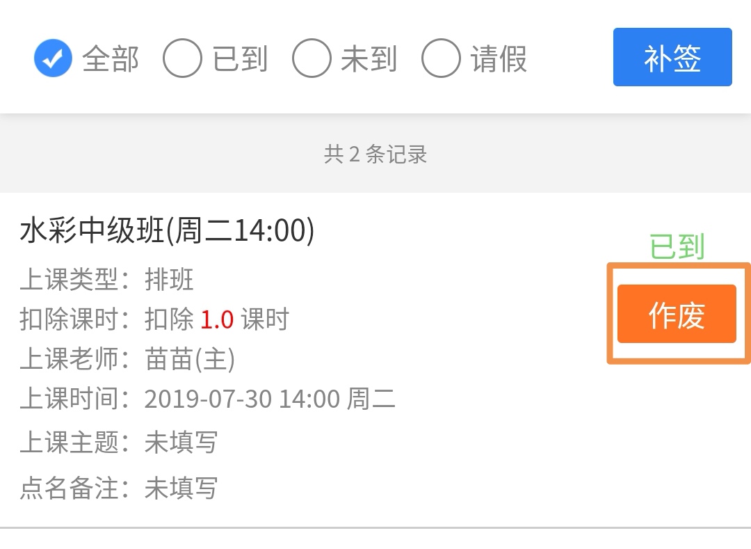 给学员错误点名后可将其作废,作废后课时返还。