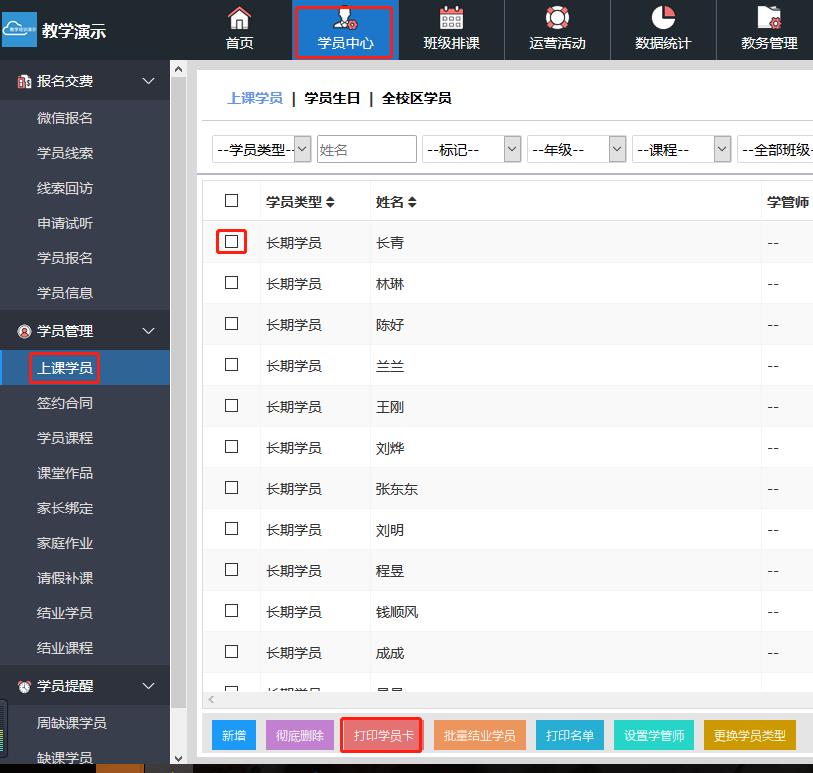 进入“学员中心”,再进入“上课学员”,勾选学员后进入“打印学员卡”。