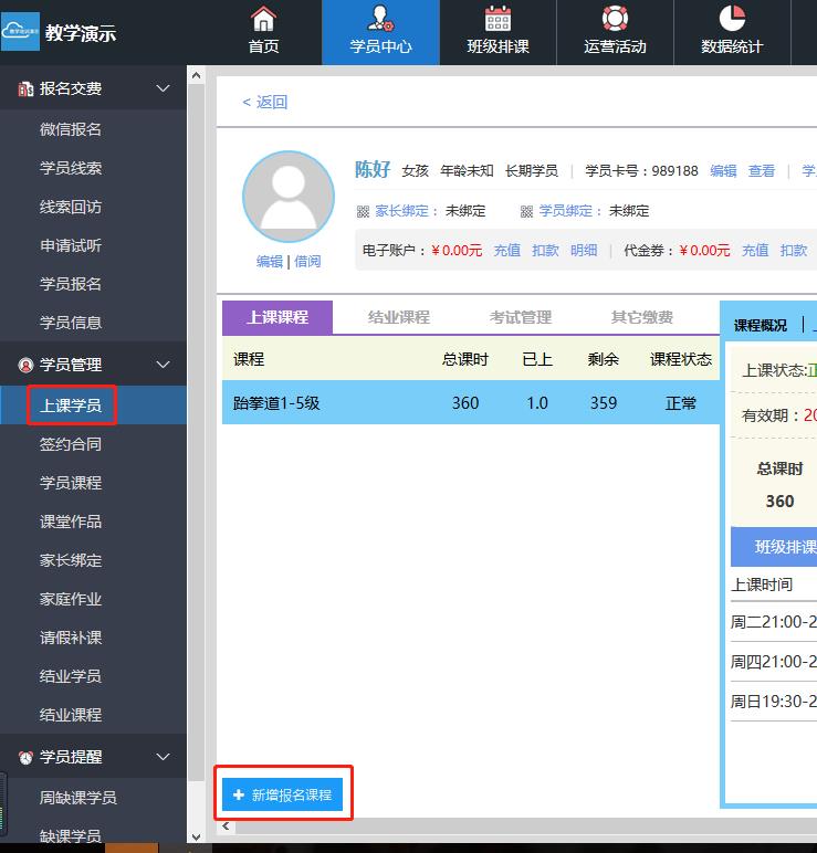 在“学员中心”进入“上课学员”,搜索需要新增报名课程的学员,再点开该学员,进入到“新增报名课程”,即可给该学员新报课程。