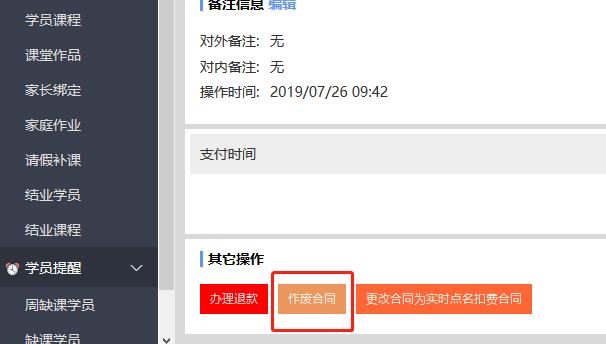 在“学员中心”进入“上课学员”,点开需要作废合同的学员,进入课程详细框里的“签约合同”,再点开合同,进入合同里的“作废合同”,编辑原因后提交。