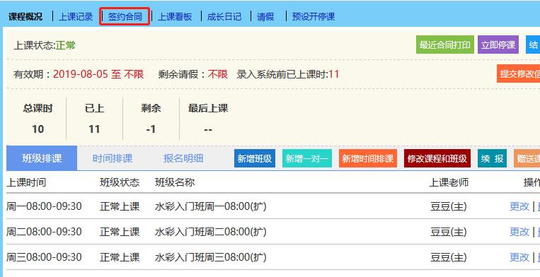 在“上课学员”里点开需要修改的学员,进入课程信息框里的“签约合同”,再点开合同,进入合同里的“编辑”修改总课时/课程总价后提交。