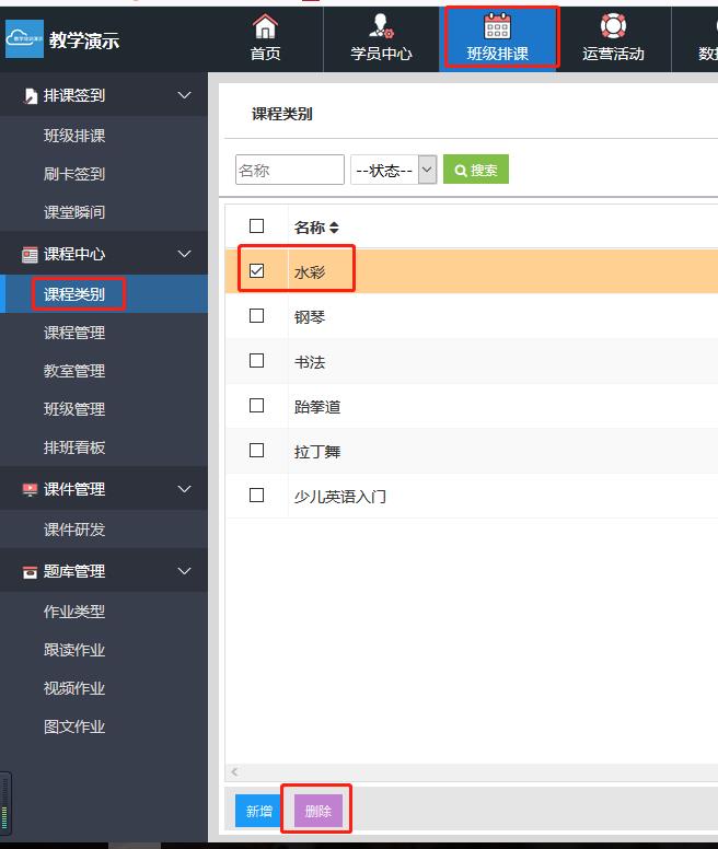 在“班级排课”里进入“课程类别”,勾选需要删除的课程,再进入“删除”。