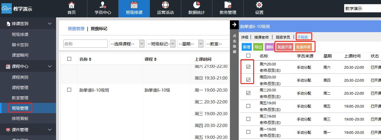 一个主班级下的部分子班级开停课:在“班级排课”里进入“班级管理”,点开需要停课或开课的班级后进入“子班级”,勾选需要停课或开课的子班级,进入“批量停课”(需要停课)或“批量开课”(需要开课)后提交