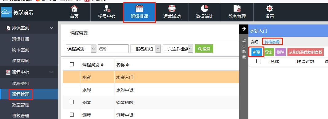 在“班级排课”里进入“课程管理”,点开需要设置套餐的课程,进入弹框里的“价格套餐”,再进入“新增”,将带“”项编辑好(不带“”项为选填项,可不编辑)后进入“添加”。