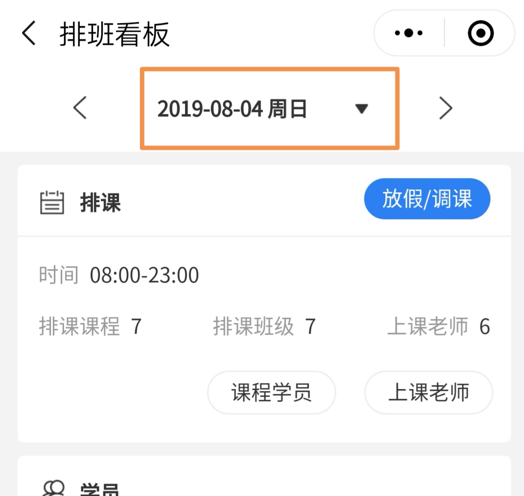 三、单个班级换时间上课或取消上课第1步:在小程序首页进入“排班看板”后搜索需要调课的日期。