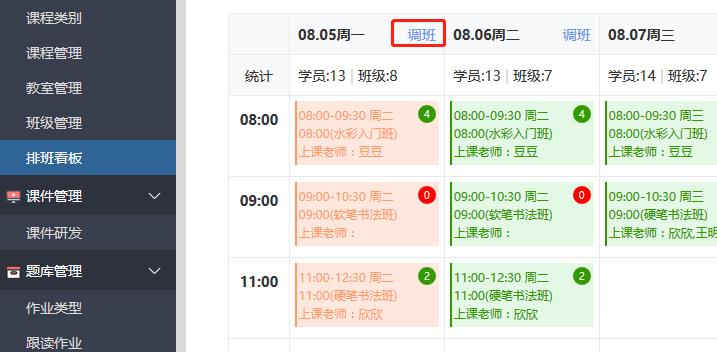 在“排班看板”里进入调课当天日期后的“调课”,选择类型为“正常排班”后进入“保存”