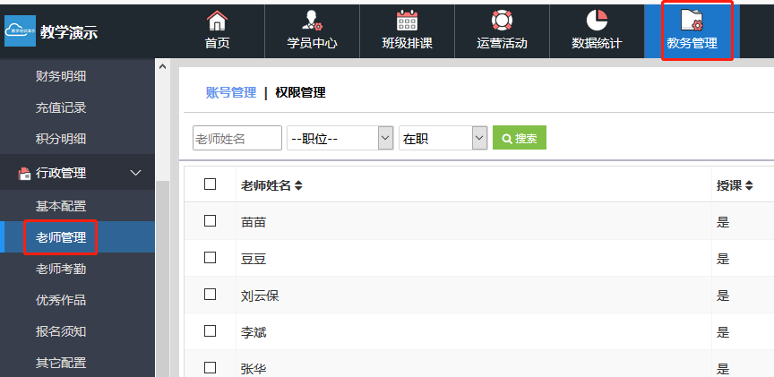 4、授课老师:只能查看自己所授课的班级和学员,以及自己的消课统计,看不到校区的招生信息、家长电话;可操作该职位开放的所有功能(作废学员消课需发请求给超级管理员同意后才可作废成功);无权限进入电脑后台。