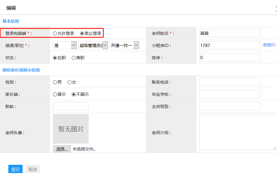 前台管理员:如需要该老师需要登录,这里选择“允许登录”,再在账号栏和密码栏设置好账号和密码,该老师可通过此账号和密码登录后台。