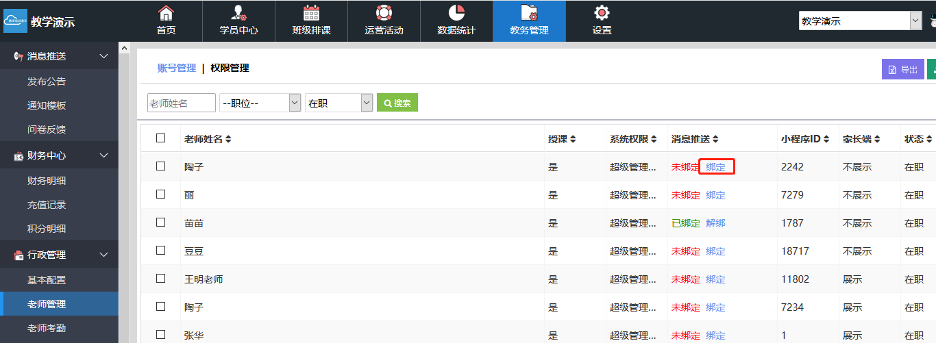 第八步:绑定老师消息通知(绑定后该老师才可以接受到消息通知,如学员请假通知、作业完成通知、家长的互动通知等等)