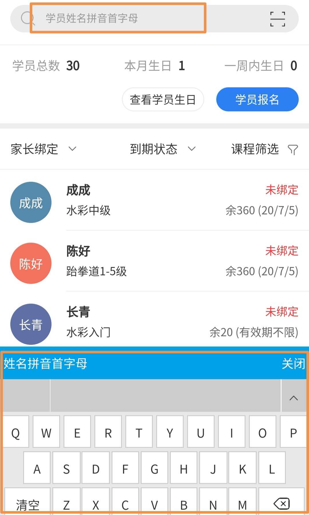 点击搜索框,在查找学员框里输入学员姓名拼音的首字母找到该学员,再点开头像。