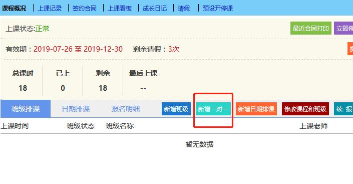 在该学员课程信息框里进入“新增一对一”对应选择老师和时间进入“添加排课”,再选择上课时间和教室后提交。