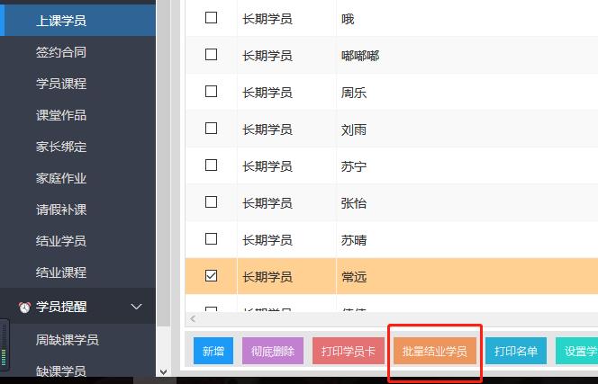 在“学员中心”进入“上课学员”,搜索需要结业的学员后勾选,再进入“批量结业学员”。