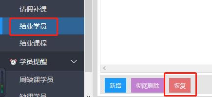 在“学员中心”进入“结业学员”,勾选需要恢复的学员,进入“恢复”。