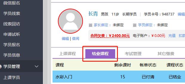 操作恢复后该学员没有报名课程,若需要继续原来的课程可进入该学员的“结业课程”里恢复课程,若需新报,进入“新增报名课程”报课;家长需重新绑定才可以进入到家长端。