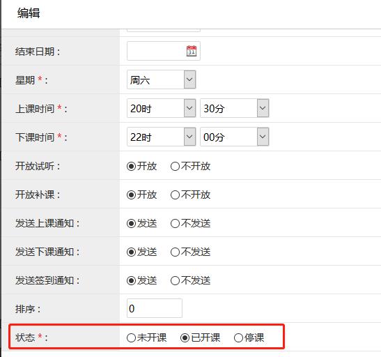 单个子班级开停课:在“班级排课”里进入“班级管理”,点开需要停课或开课的班级后进入“子班级”,再进入需要开课或停课班级后的“编辑”,在状态后选“停课”(需要停课)或选择“已开课”(需开课)后提交。