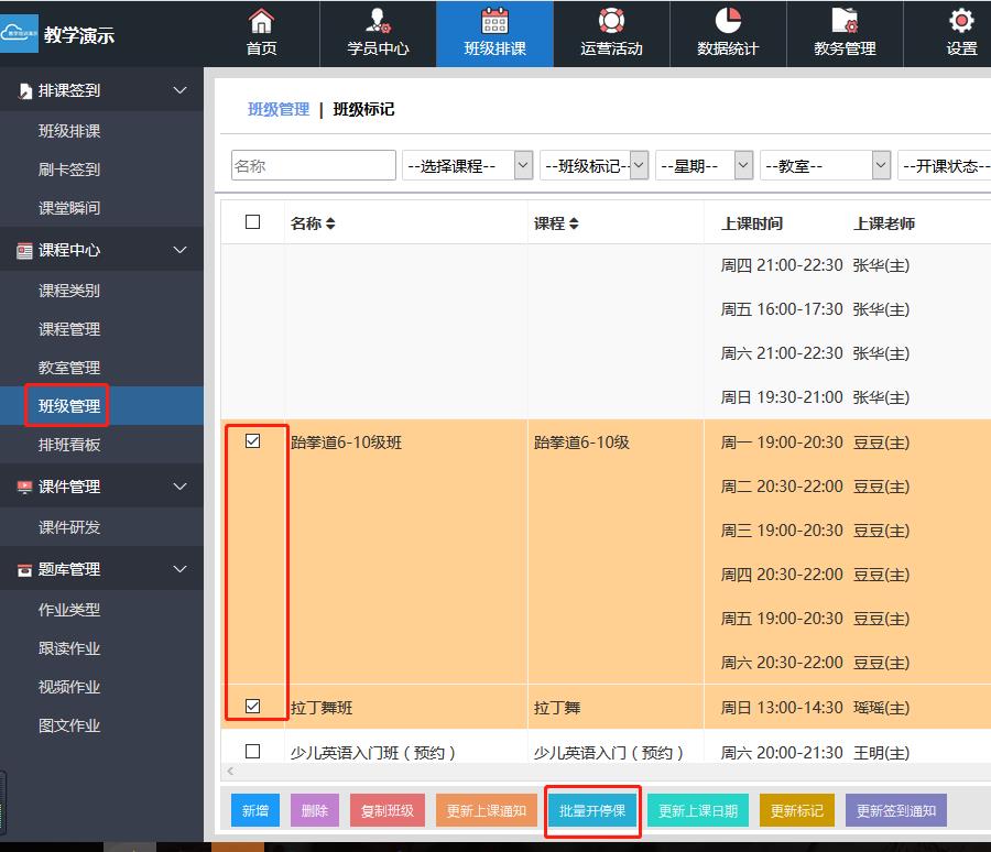 操作:批量开停课:在“班级排课”里进入“班级管理”,勾选需要停课或开课的班级,进入“批量开停课”,选择“停课”(需停课)或选择“开课”(需开课)和选择需要更新的班级后,进入“提交”。