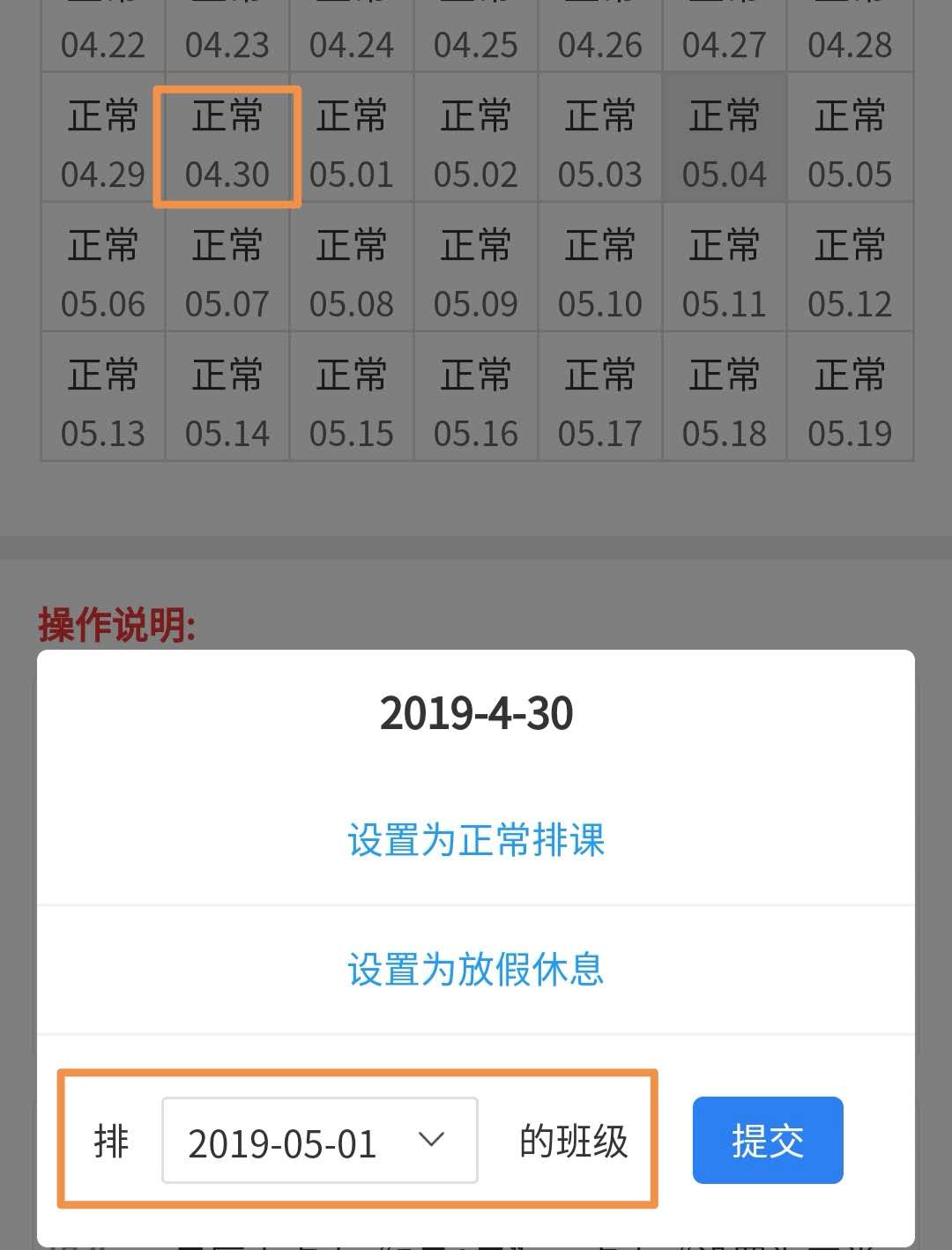 第2步:在日历里选择调至上课的日期,再进入弹框里选择需要调课的日期(如5月1日的课调到4月30日,日历中点击“04月30日”,调课日期选择“05月1日”;(注:若4月30号有排课,调课后将被5月1日的课覆盖),再进入“提交”。
