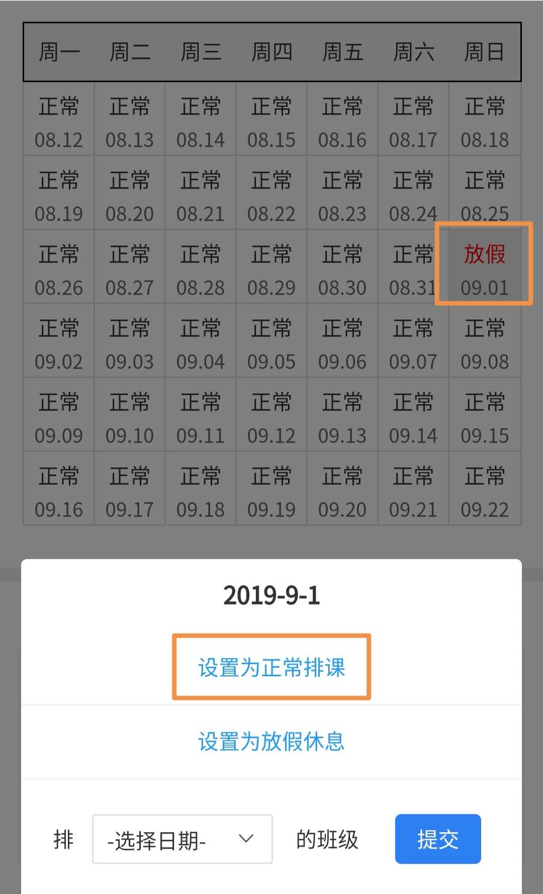 在“排班看板”里进入“放假/调课”,在日历里点击调课当天日期,再进入弹框里的“设置为正常排课”后确认。