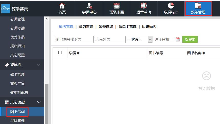说明:需先设置借书信息,学员才可借书。学员借书可家长在家长端的“图书借阅”里自行操作借书,然后老师在后台操作发放即可,也可老师在后台直接操作借书给学员。