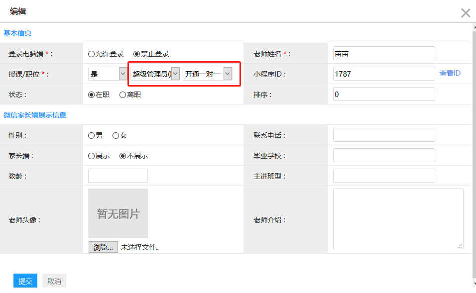 前台管理员:如需要该老师需要登录,这里选择“允许登录”,再在账号栏和密码栏设置好账号和密码,该老师可通过此账号和密码登录后台。