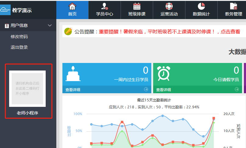2、前台管理员:可查看所在校区的所有数据(包括该校区的数据统计、财务统计及明细、家长电话、招生信息),可操作该职位开放的所有功能。修改学员课程信息(如修改总课时、修改总费用、修改请假次数、换课程、作废充值、作废学员消课等)需发请求给超级管理员在小程序上审批同意才可修改成功。可通过自行设置的账号进入到电脑端后台。